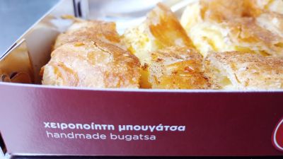 Bugatsa-kaka, som jag fick eller köpte på ett kafé i närheten av busstationen. En mycket vänlig och hjälpsam man arbetade där; jag besökte kaféet ett par gånger.