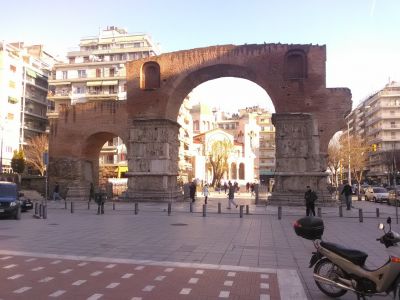 En liten bit söderut ligger Galerius välbevarade triumfbåge. Alldeles intill brusar trafiken på Via Egnatia - den gamla romerska riksvägen österut.