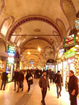 Åter nere på marken passerade jag universitetet och var snart framme vid ingången till Stora basaren; den stod färdig 1481. Jag gick in i den myllrande inomhusstaden. Vacker är den med sina välvda tak över inte alltid helt spikraka gator. Var och en korsas av ett otal andra som förlorar sig någonstans i fjärran. Folklivet får man på köpet - här rör sig människor i alla åldrar. En syn kände jag igen från basarkvarteren i Skopje: män bärande på brickor med ångande teglas.