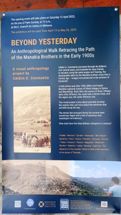 Utanför konstgalleriet Averoff drogs mina blickar till en affisch som gjorde reklam för en fotoutställning med bland andra Rumänska Kulturinstitutet som arrangör. En rumänsk fotograf, C. D. Constantin, hade i arkiv i Bukarest hittat foton tagna av bröderna Manakia i vlachiska byar i dagens Nordmakedonien, Albanien och Grekland kring sekelskiftet 1800/1900. Constantin bestämde sig för att vandra i bröderna Manakias fotspår och hitta platserna där de stått när de fotograferade. Så uppstod ett material som låter oss uppleva en rad platser då och nu. Utförliga texter på engelska och grekiska kommenterade bildparen.